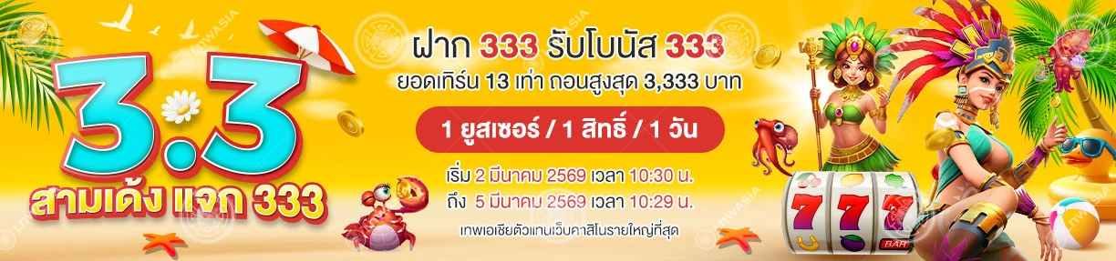 สนุกกับโบนัสพิเศษที่ให้เฉพาะสมาชิกเทพเอเชีย เพียงฝาก 333 บาท รับโบนัส 333 บาท ถอนได้สูงสุด 3,333 บาท เทิร์นโอเวอร์ 13 เท่า สมาชิก 1 ยูสเซอร์ รับ 1 สิทธิ์ต่อ 1 วัน เฉพาะเกมสล็อตและยิงปลาจีคลับ ระยะเวลาเริ่มตั้งแต่ 2 มีนาคม 2568 เวลา 10:30 น. ถึง 5 มีนาคม 2568 เวลา 10:29 น. วิธีรับโบนัส สมาชิกจะต้องฝากเงินยอด 333 บาทเท่านั้น และมีสิทธิ์ได้รับโบนัสเพิ่ม 333 บาททันที สมาชิกจะต้องแจ้งขอรับโบนัสพร้อมเติมเงินกับเจ้าหน้าที่ฝ่ายบริการลูกค้า ได้ที่ทางไลน์ หรือแชทสด 1 ยูสเซอร์ สามารถรับได้ 1 สิทธิ์ต่อวันเท่านั้น (ตัดรอบ 10:30 […]