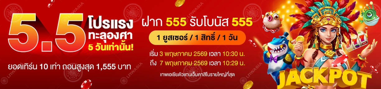 5.5 โปรแรงทะลุองศา โบนัสพิเศษมอบให้เฉพาะสมาชิกเทพเอเชีย เพียงฝาก 555 บาท รับโบนัส 555 บาท ถอนได้สูงสุด 1,555 บาท เทิร์นโอเวอร์ 10 เท่า สมาชิก 1 ยูสเซอร์ รับ 1 สิทธิ์ต่อ 1 วัน เฉพาะเกมสล็อตและยิงปลาจีคลับ ระยะเวลาเริ่มโปรโมชั่น ตั้งแต่ 3 พฤษภาคม 2569 เวลา 10:30 น. ถึง 7 พฤษภาคม 2569 เวลา 10:29 น. วิธีรับโบนัส สมาชิกจะต้องฝากเงินยอด 555 บาทเท่านั้น และมีสิทธิ์ได้รับโบนัสเพิ่ม 555 บาททันที สมาชิกจะต้องแจ้งขอรับโบนัสพร้อมเติมเงินกับเจ้าหน้าที่ฝ่ายบริการลูกค้า ได้ที่ทางไลน์ หรือแชทสด 1 ยูสเซอร์ สามารถรับได้ 1 สิทธิ์ต่อวันเท่านั้น (ตัดรอบ […]